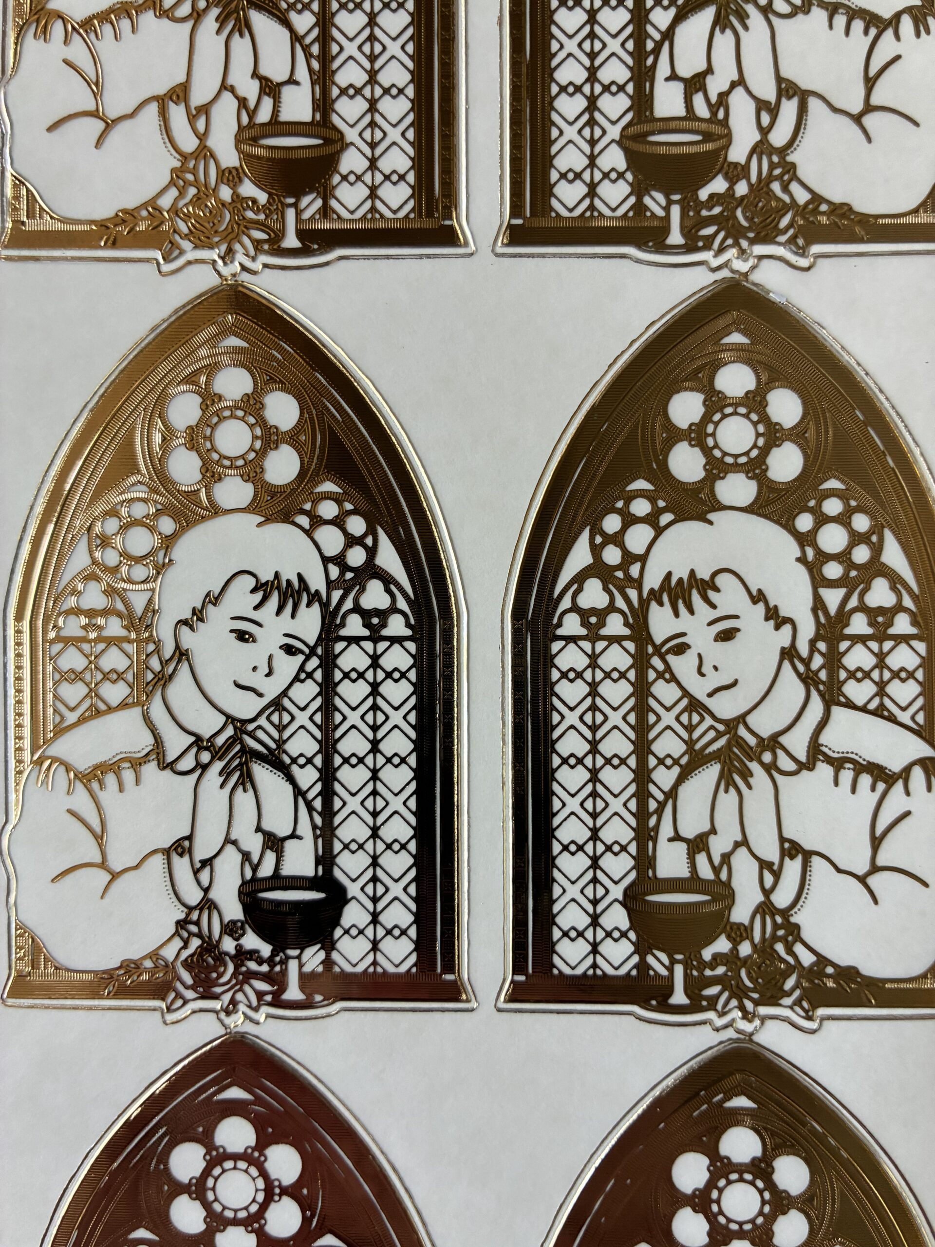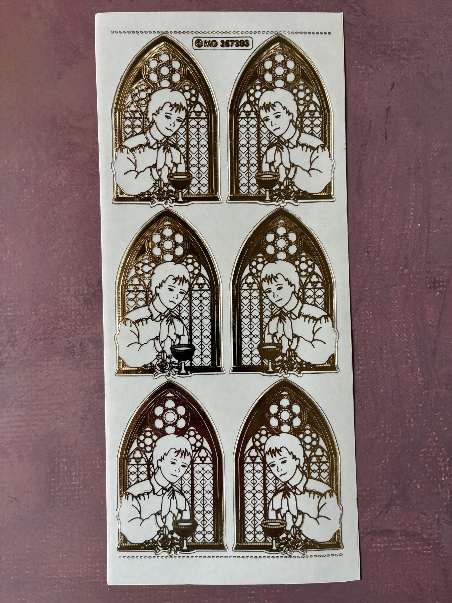 This sheet of religious themed peel off stickers features six double embossed images of a boy standing in front of a church window in a gold colour with a transparent background. Perfect for first holy communion card making and other religious themed craft projects. Each sheet is DL in size approximately 10cms wide x 23cms long (a third of an A4 sheet).