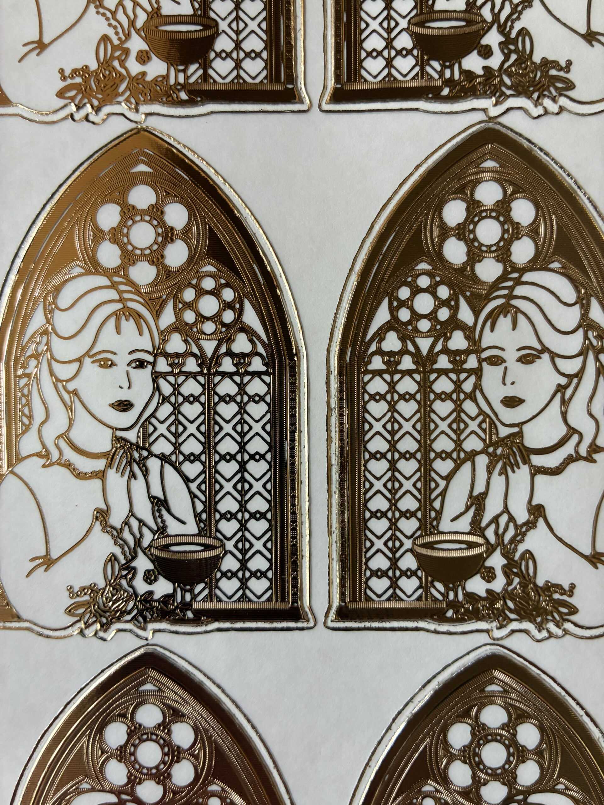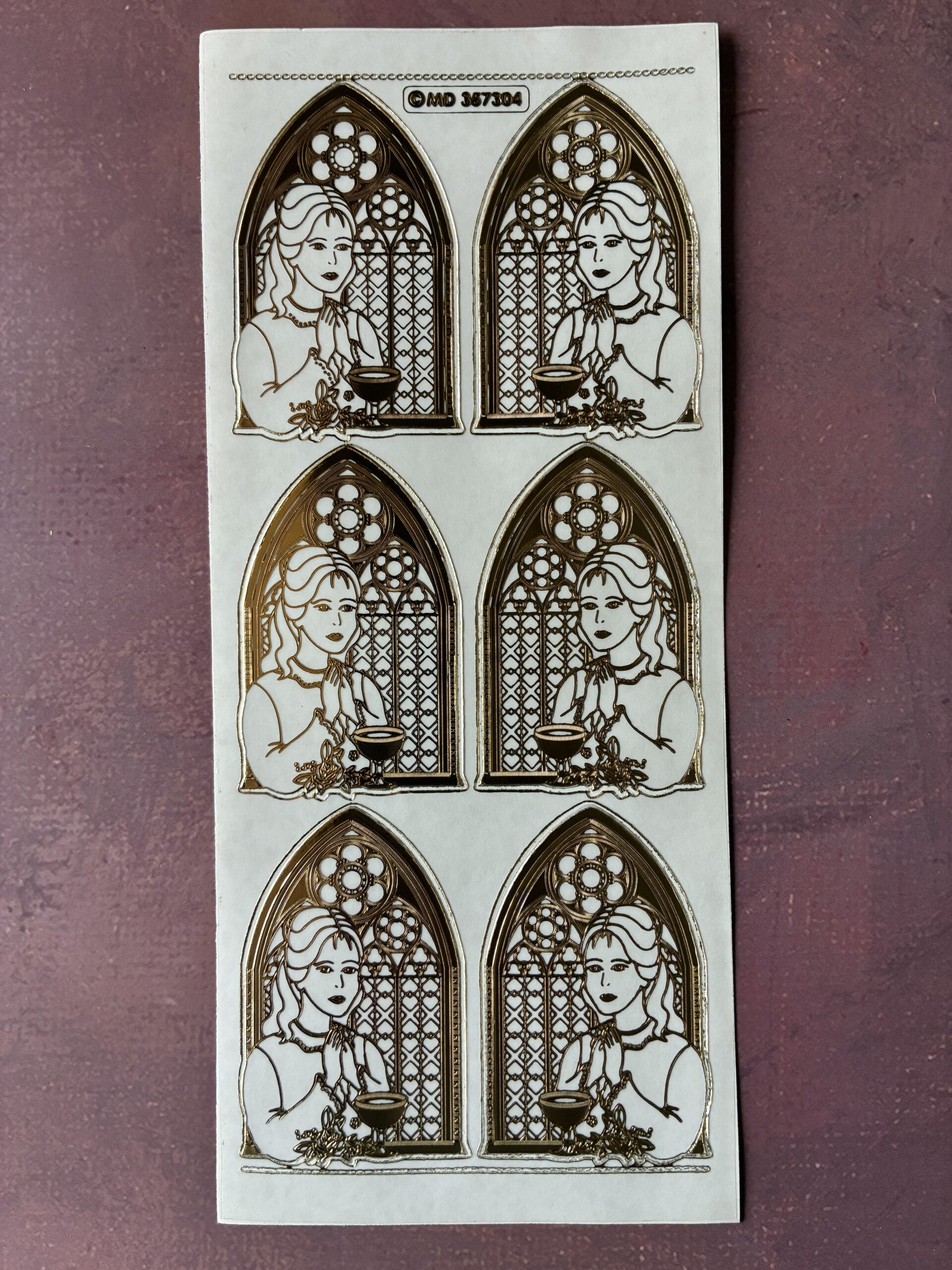 This sheet of religious themed peel off stickers features six double embossed images of a girl standing in front of a church window in a gold colour with a transparent background. Perfect for first holy communion card making and other religious themed craft projects. Each sheet is DL in size approximately 10cms wide x 23cms long (a third of an A4 sheet).