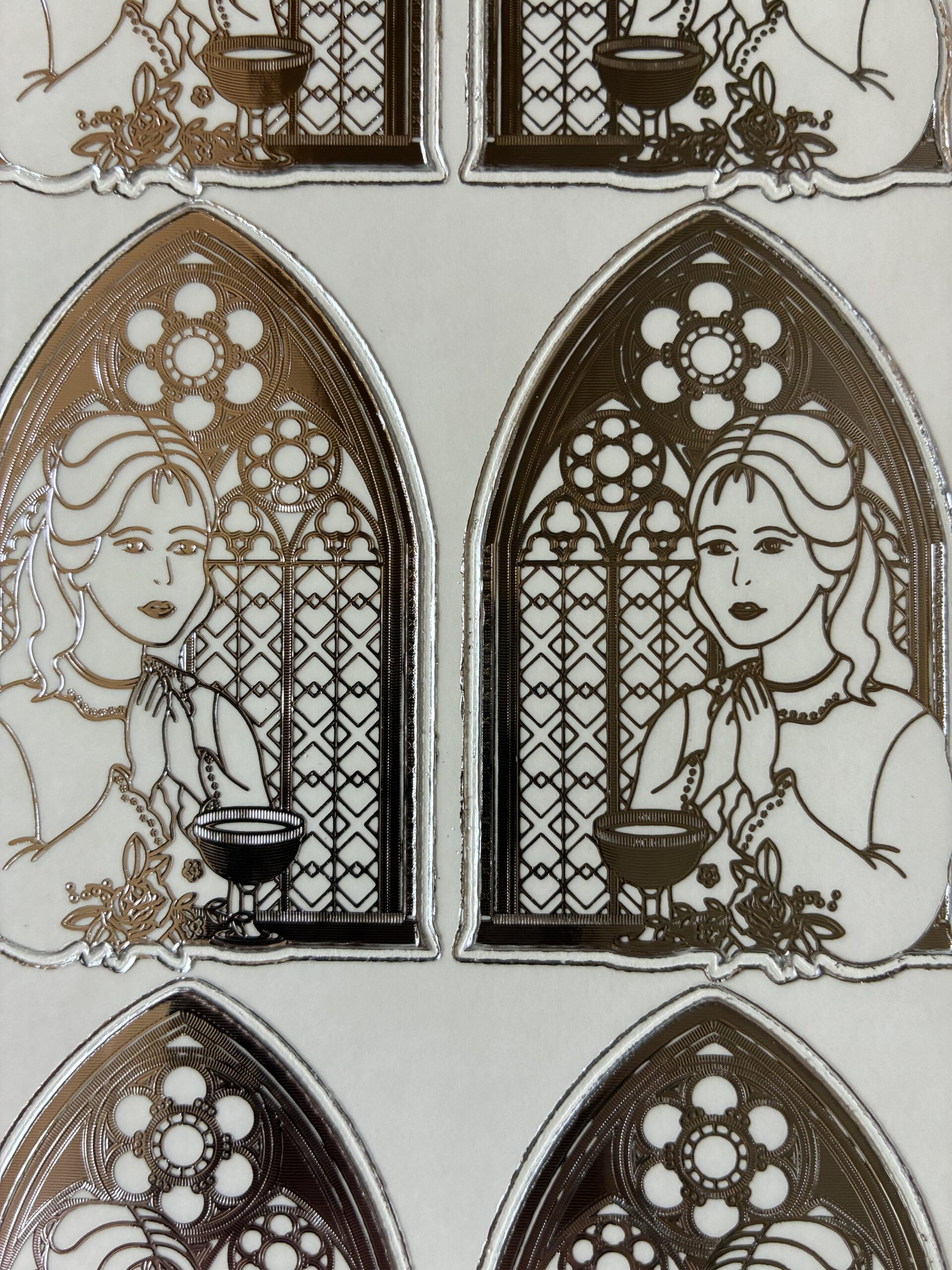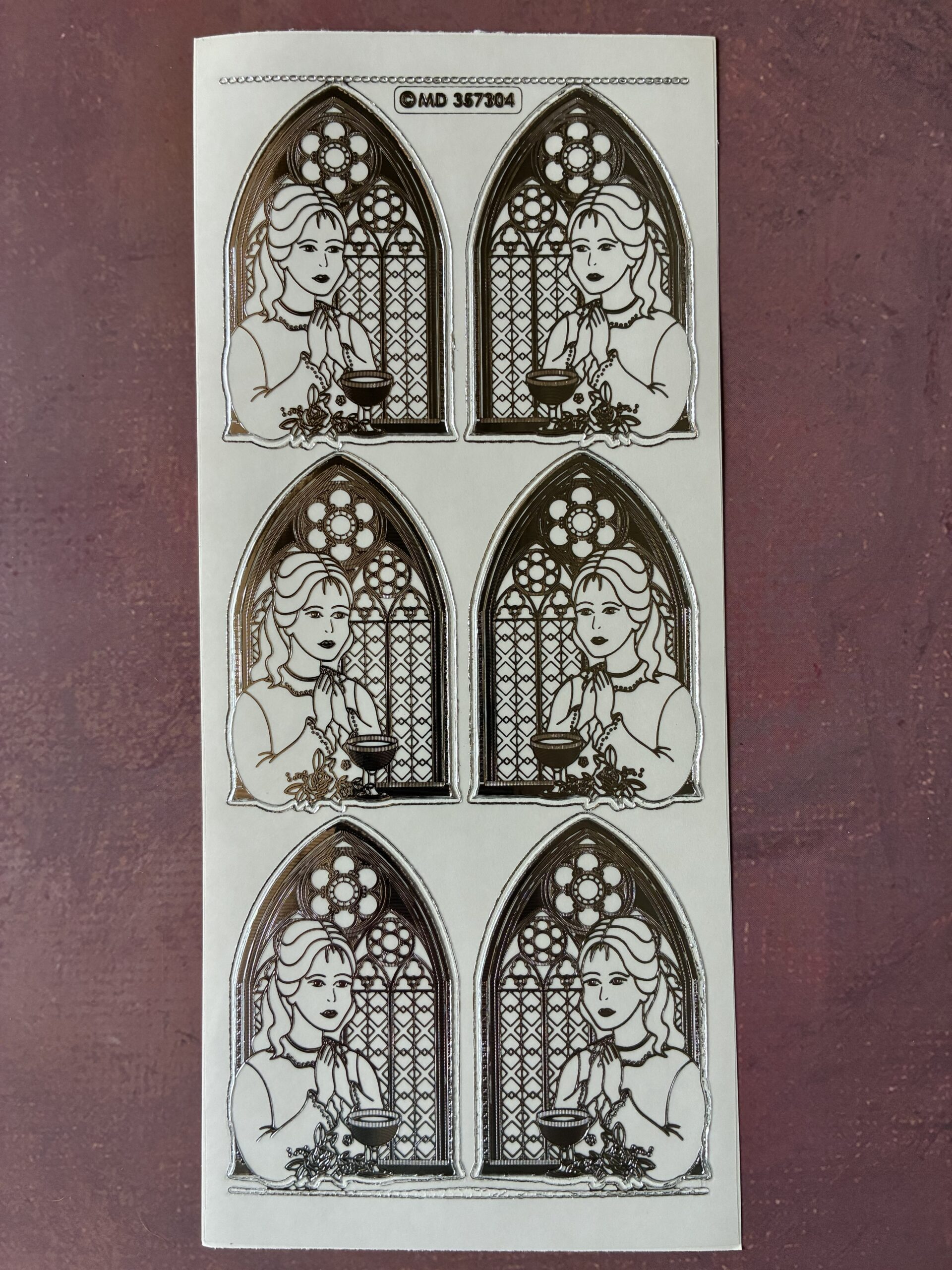 This sheet of religious themed peel off stickers features six double embossed images of a girl standing in front of a church window in a silver colour with a transparent background. Perfect for first holy communion card making and other religious themed craft projects. Each sheet is DL in size approximately 10cms wide x 23cms long (a third of an A4 sheet).