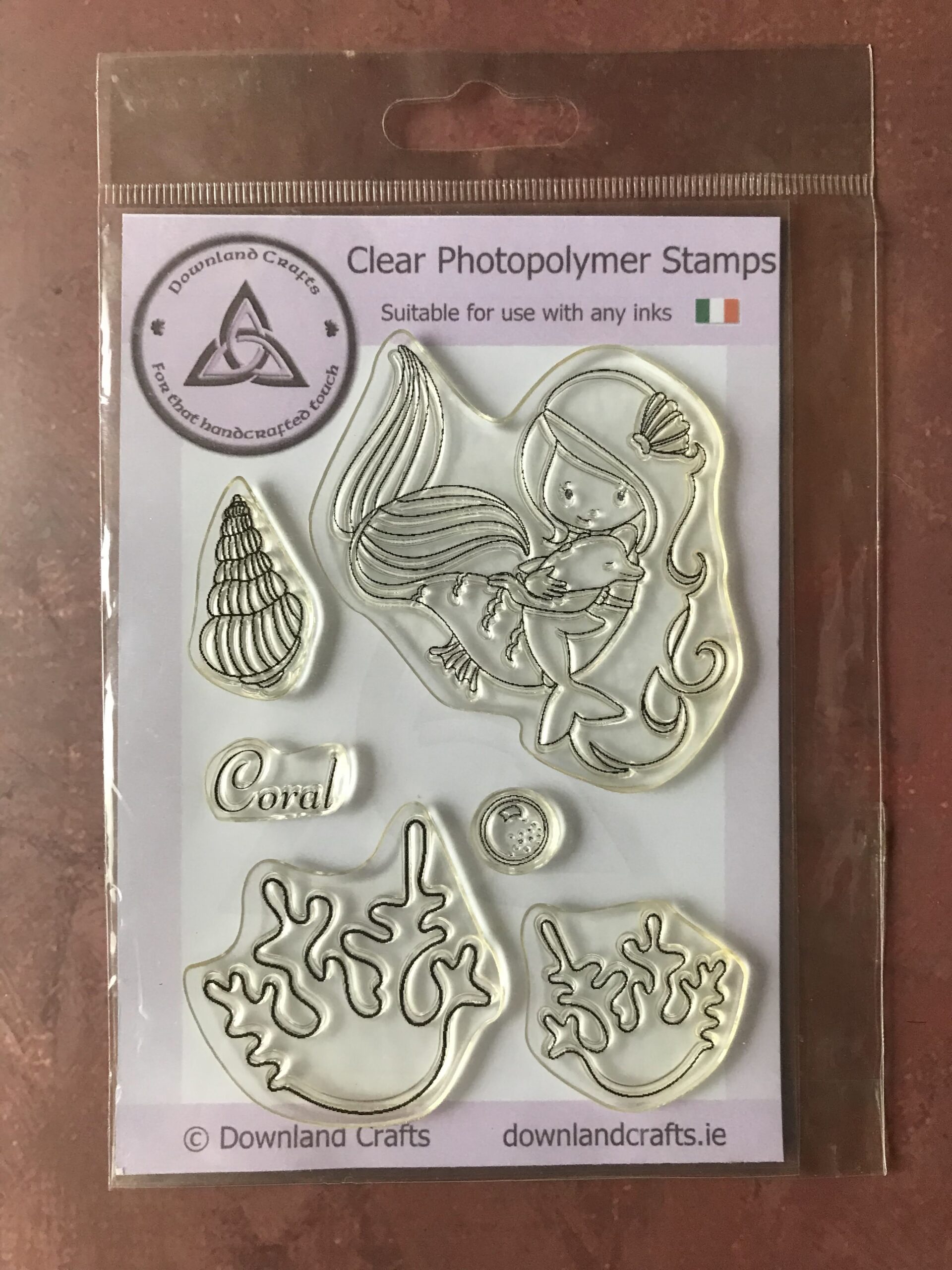 This A6 size set of under the sea stamps features a mermaid holding a dolphin stamp, two coral stamps, a shell stamp, a bubble or pearl stamp, and the word ‘Coral’.