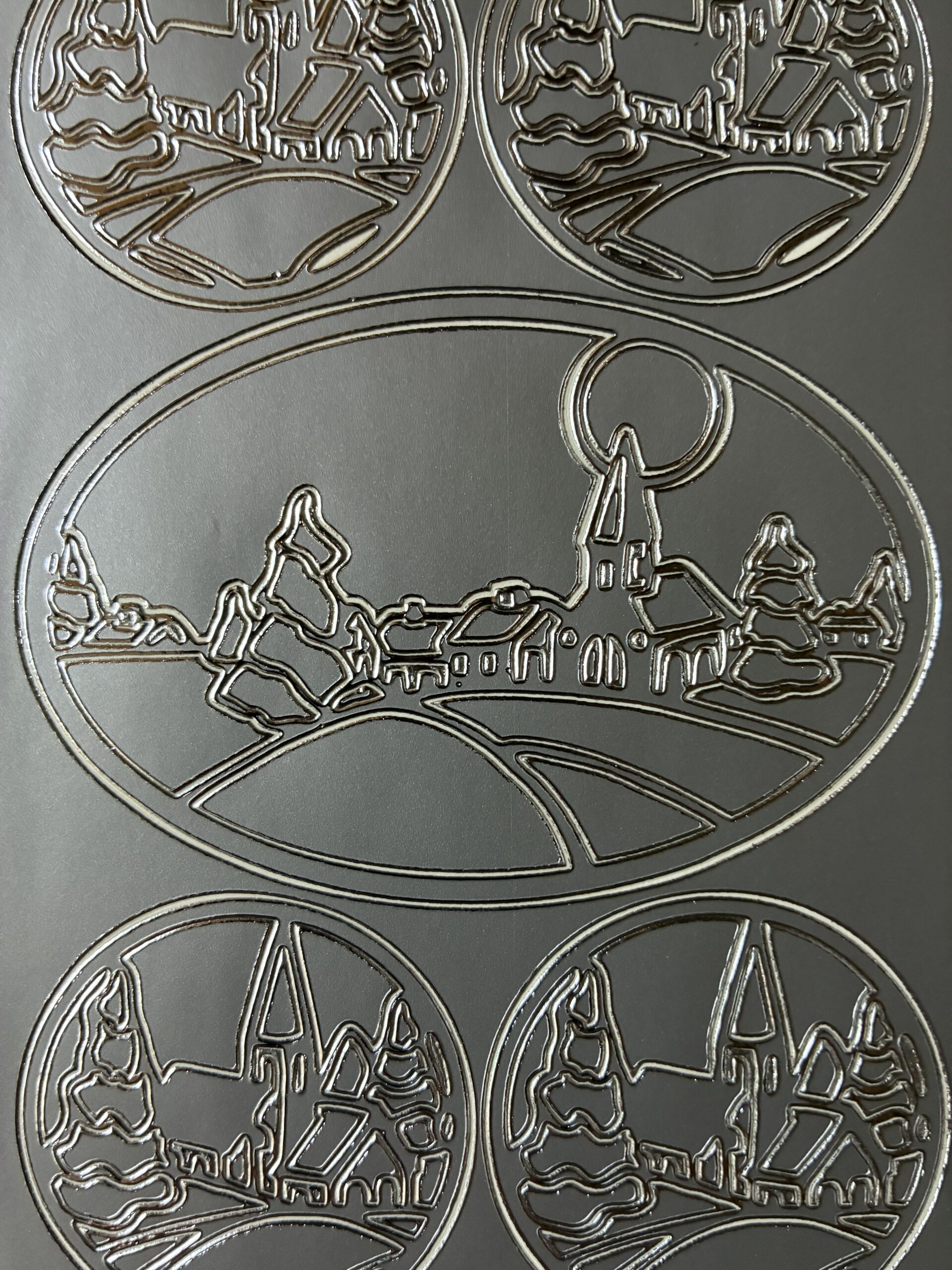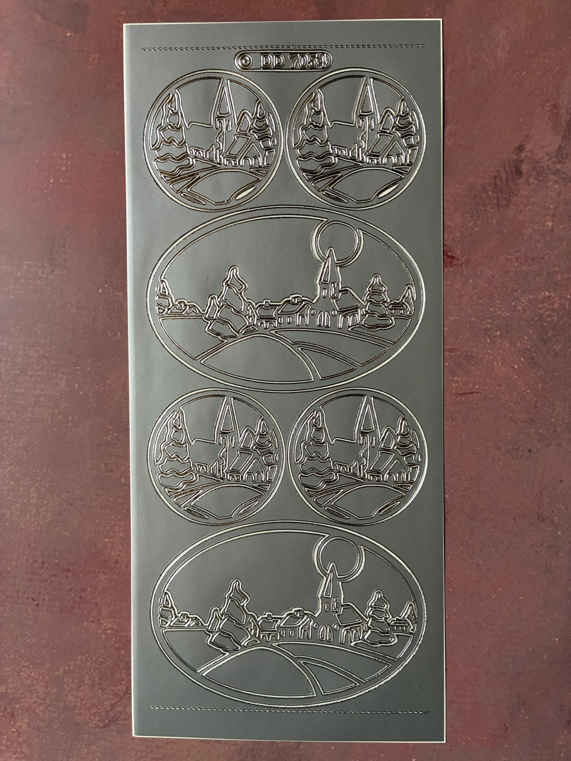 This sheet of festive image peel off stickers features six winter village scenes with trees, houses and a church in a silver colour. Perfect for Christmas card making and other festive craft projects. Each sheet is DL in size approximately 10cms wide x 23cms long (a third of an A4 sheet).
