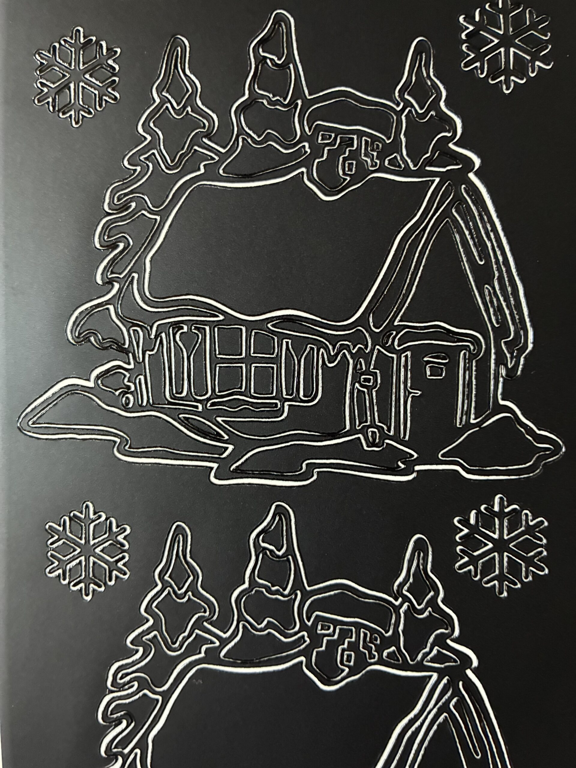 This sheet of festive image peel off stickers features two large cottages and two smaller cottages with trees and snowflakes in a matte black colour. Perfect for Christmas card making and other festive craft projects. Each sheet is DL in size approximately 10cms wide x 23cms long (a third of an A4 sheet).